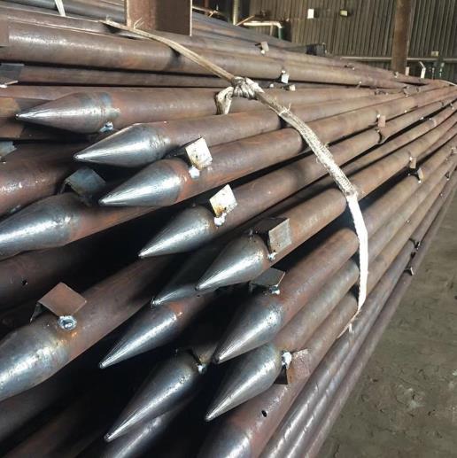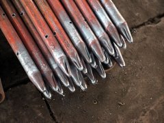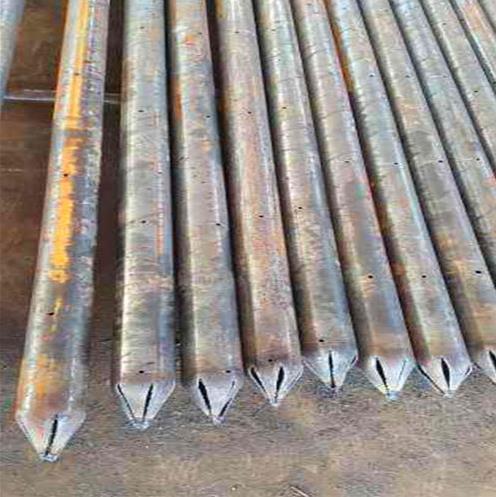 超前小导管一般采用直径38~50mm的无缝钢管制作。在小导管的前端做成约10cm长的圆锥状,在尾端焊接直径6~8mm钢筋箍。距后端100cm内不开孔,剩余部分按20~30cm梅花形布设直径6mm的溢浆孔。